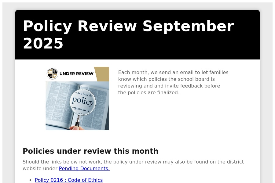 Policy Review September 2025 Each month, we send an email to let families know which policies the school board is reviewing and and invite feedback before t. . .