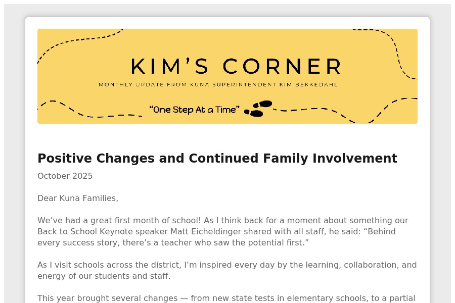 Positive Changes and Continued Family Involvement October 2025 Dear Kuna Families, Weve had a great first month of school! As I think back for a moment about something our Back to School. . .