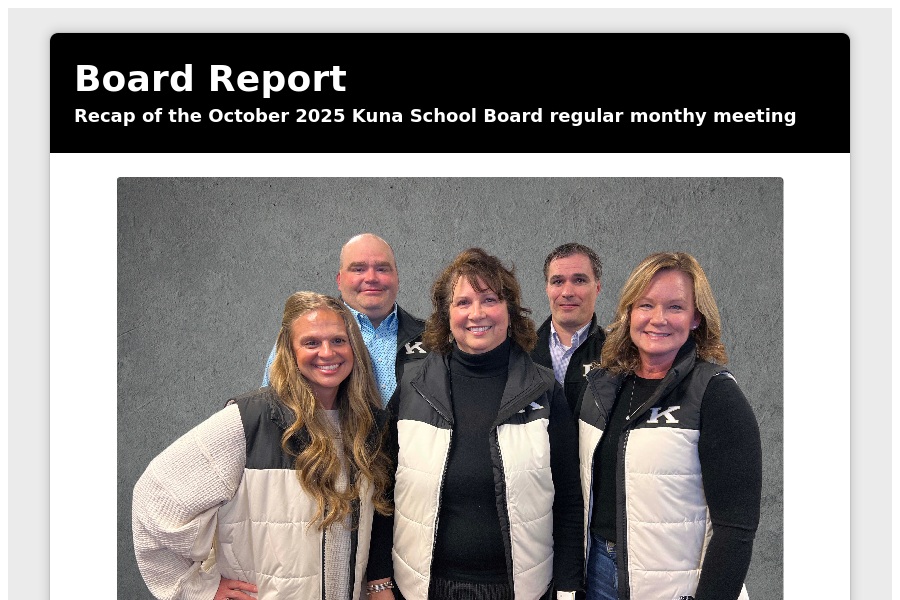 Board Report Recap of the October 2025 Kuna School Board regular monthy meeting October highlights The Kuna school board met on Tuesday, October 14, 2025 . . .
