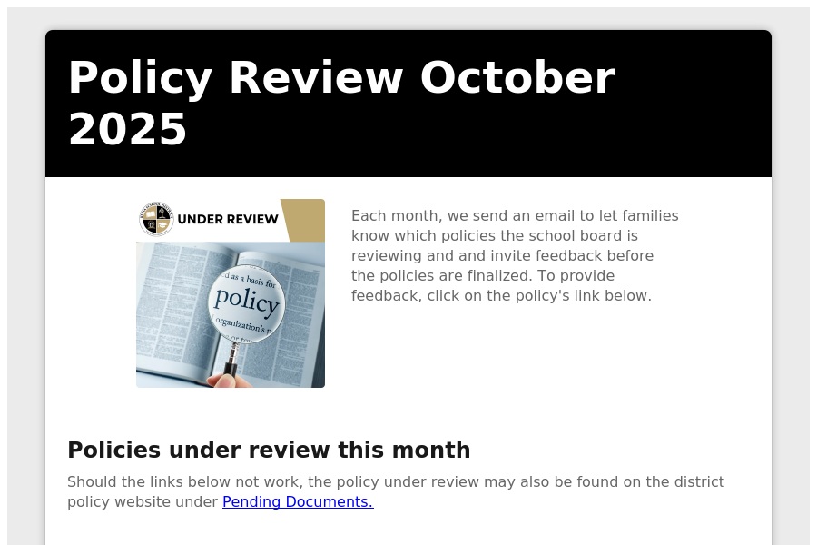 Policy Review October 2025 Each month, we send an email to let families know which policies the school board is reviewing and and invite feedback before the. . .